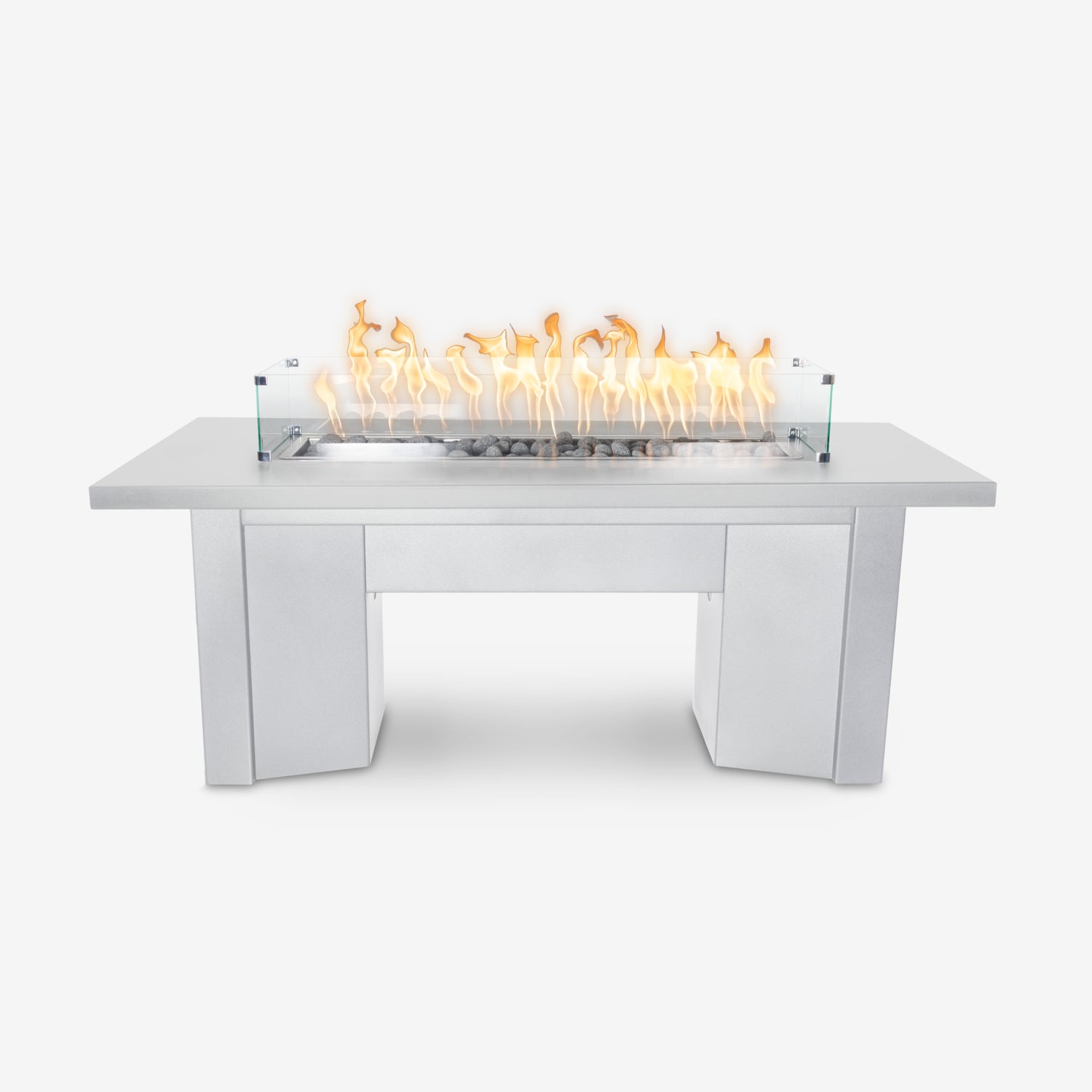 For a more dramatic appearance, the Alameda can be ordered with rustic or metallic GFRC concrete finishes on the top. These textured surfaces add depth and personality, while the powder-coated base still allows for flexible color options. Together, they transform the piece into a dining height fire pit table that feels unique and expressive. The central fire channel runs the full length of the top, creating the familiar effect of a dining table with fire pit in the middle.
