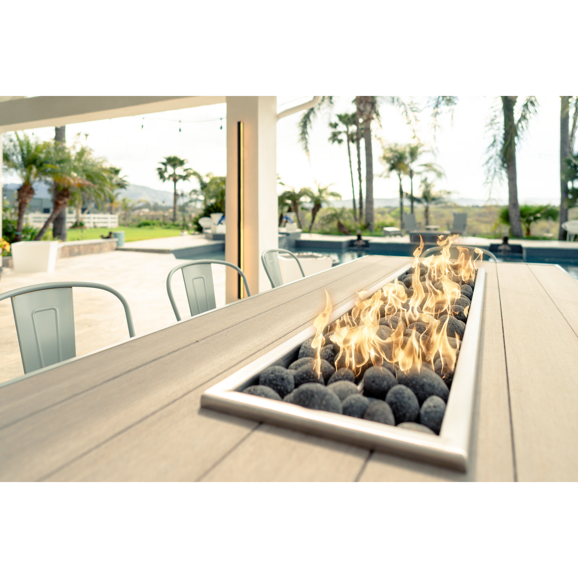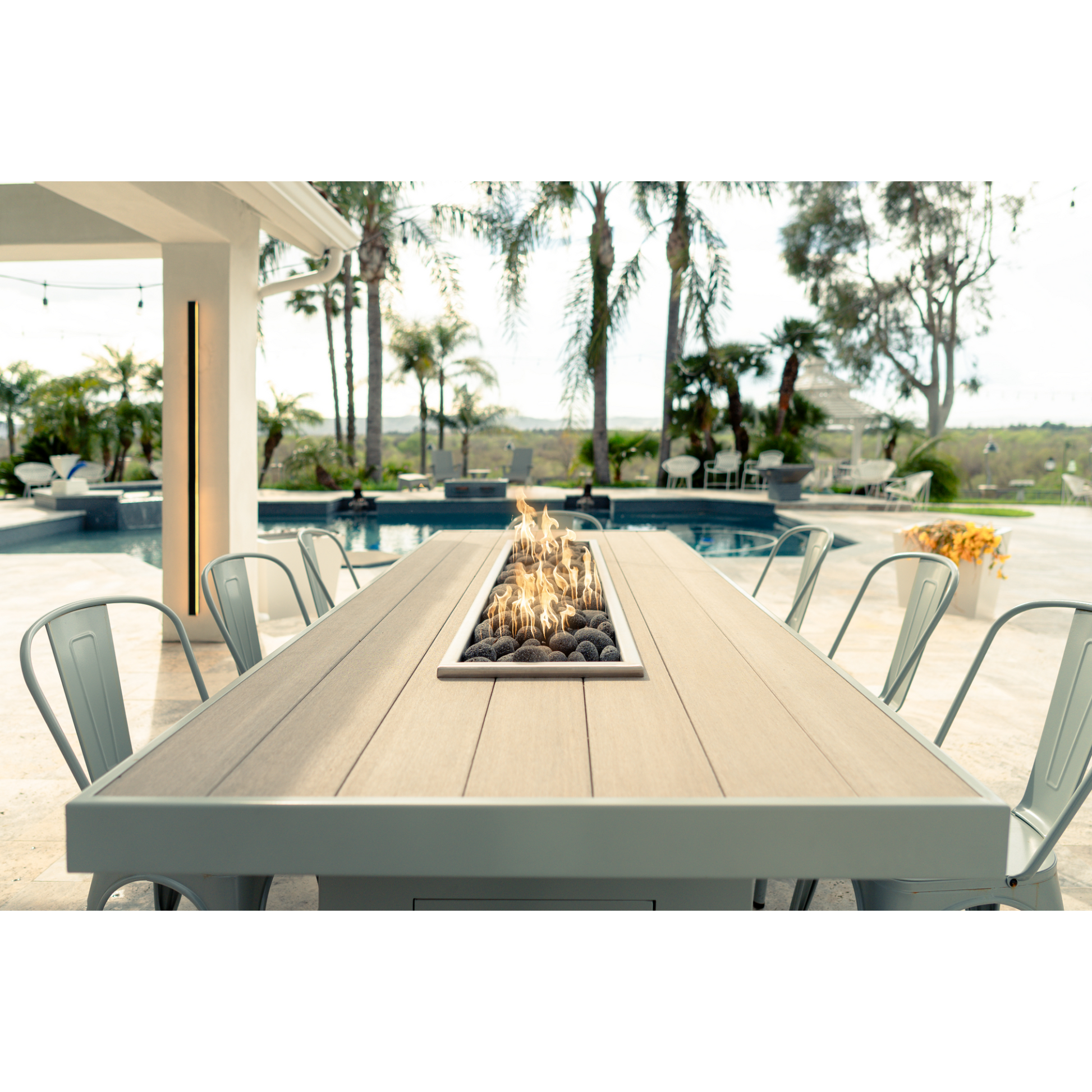 The Alameda’s linear fire channel runs lengthwise down the center of the table (size dependent), which means both long sides benefit evenly from the warmth and ambiance.