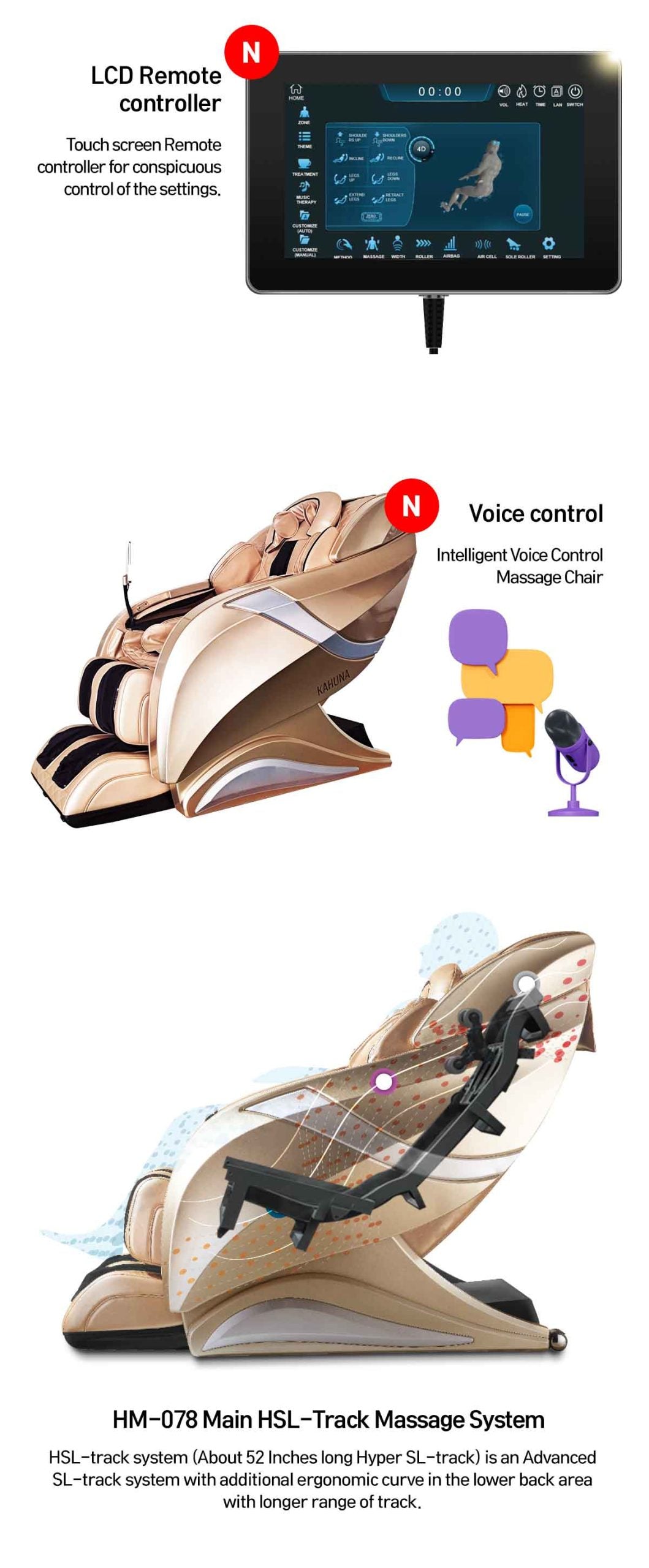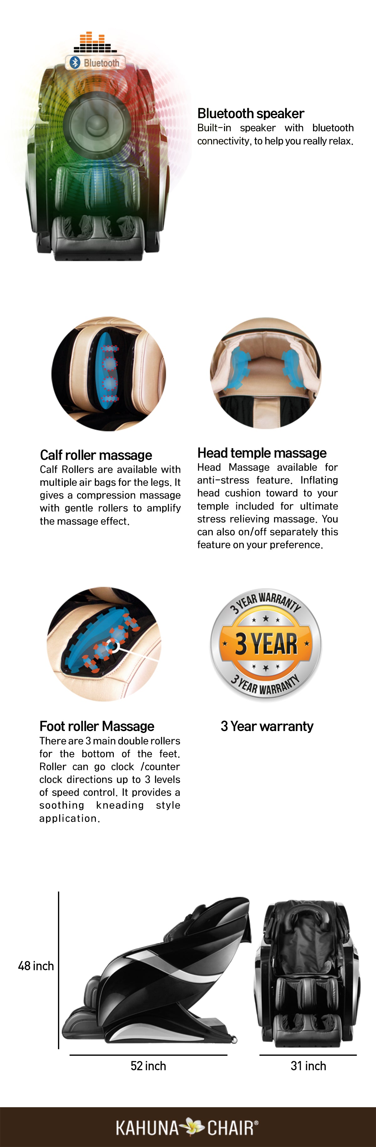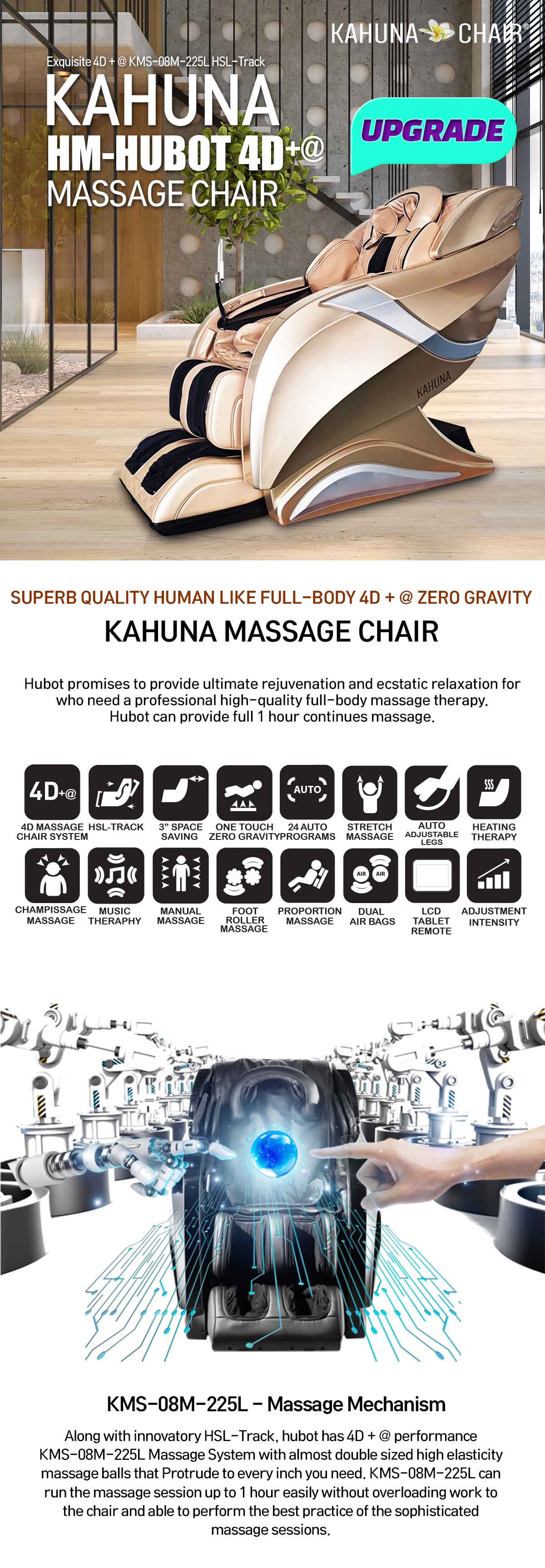 The Kahuna Hubot Massage Chair is designed to provide a comprehensive full-body massage experience. Featuring a 4D HSL-Track system, it utilizes quad rollers to deliver massage coverage from the neck down to the glutes. The chair includes body scanning technology to adjust the massage to the user's body dimensions, accommodating individuals up to 6'2" in height and 350 lbs in weight.