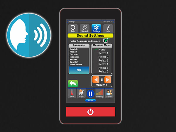 The Luraco Model 3 Hybrid SL includes a human voice response system capable of communicating in seven languages: English, Vietnamese, Spanish, German, French, Japanese, and Korean. The chair comes preset in English, but changing the language can be done easily from the control menu, allowing users to enjoy personalized interaction.