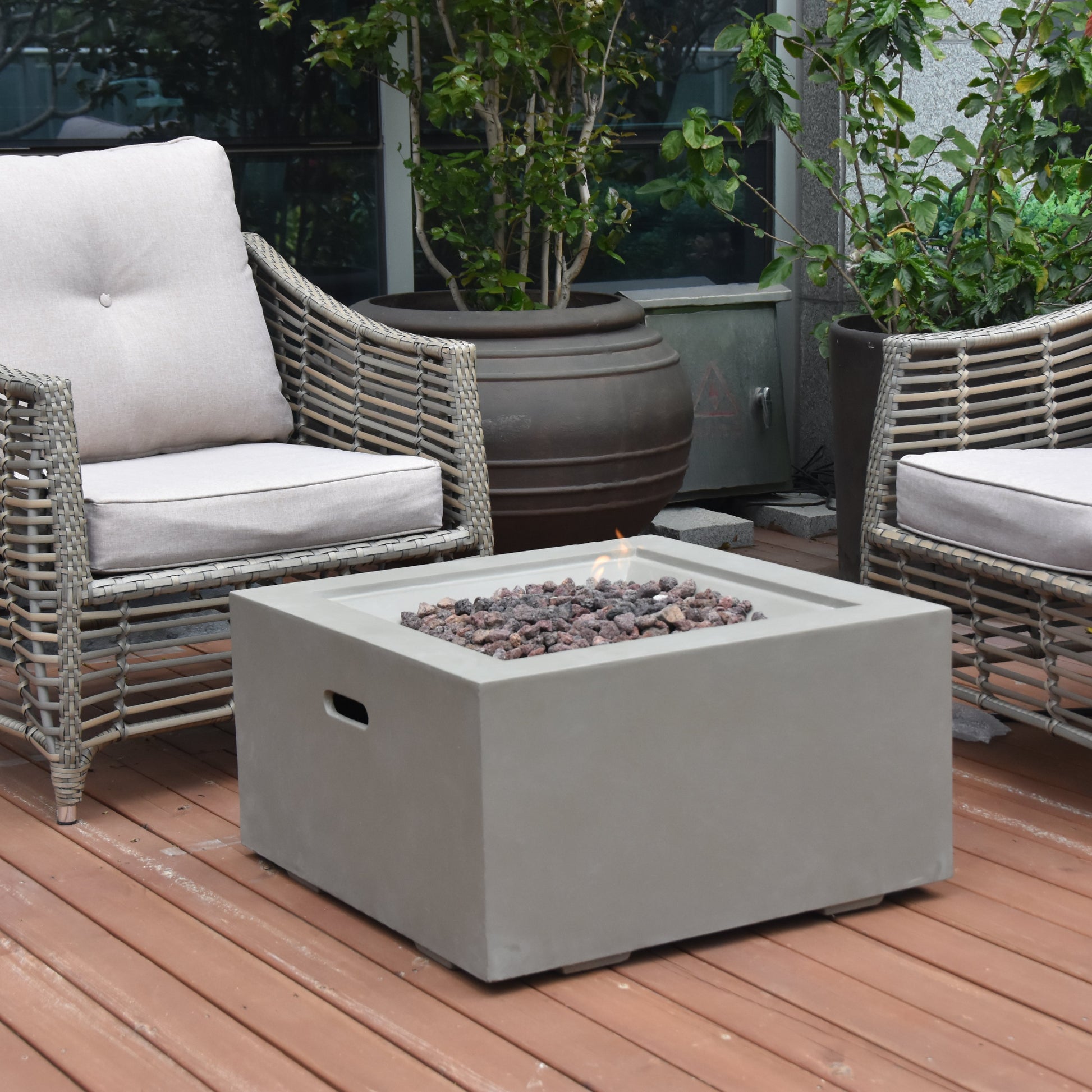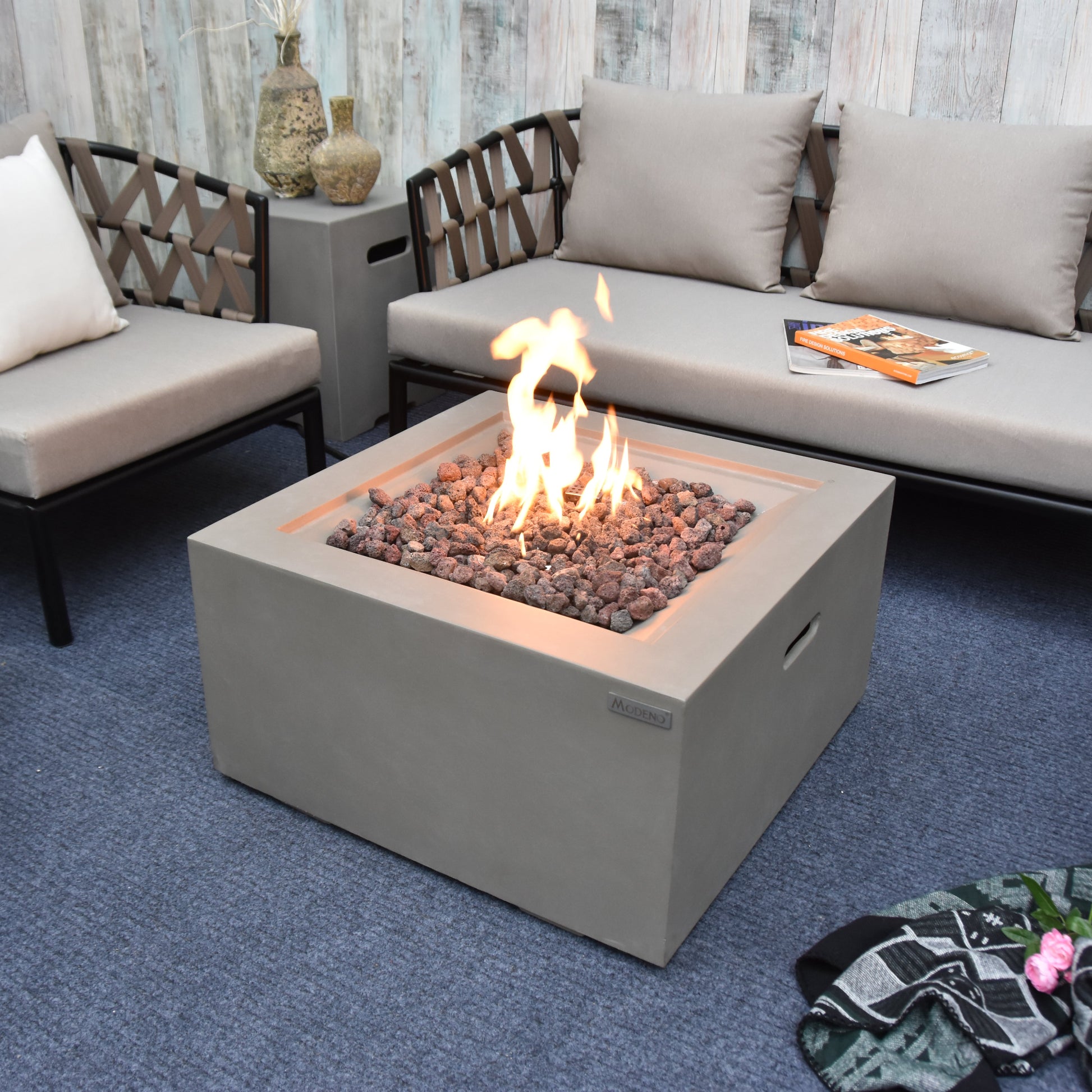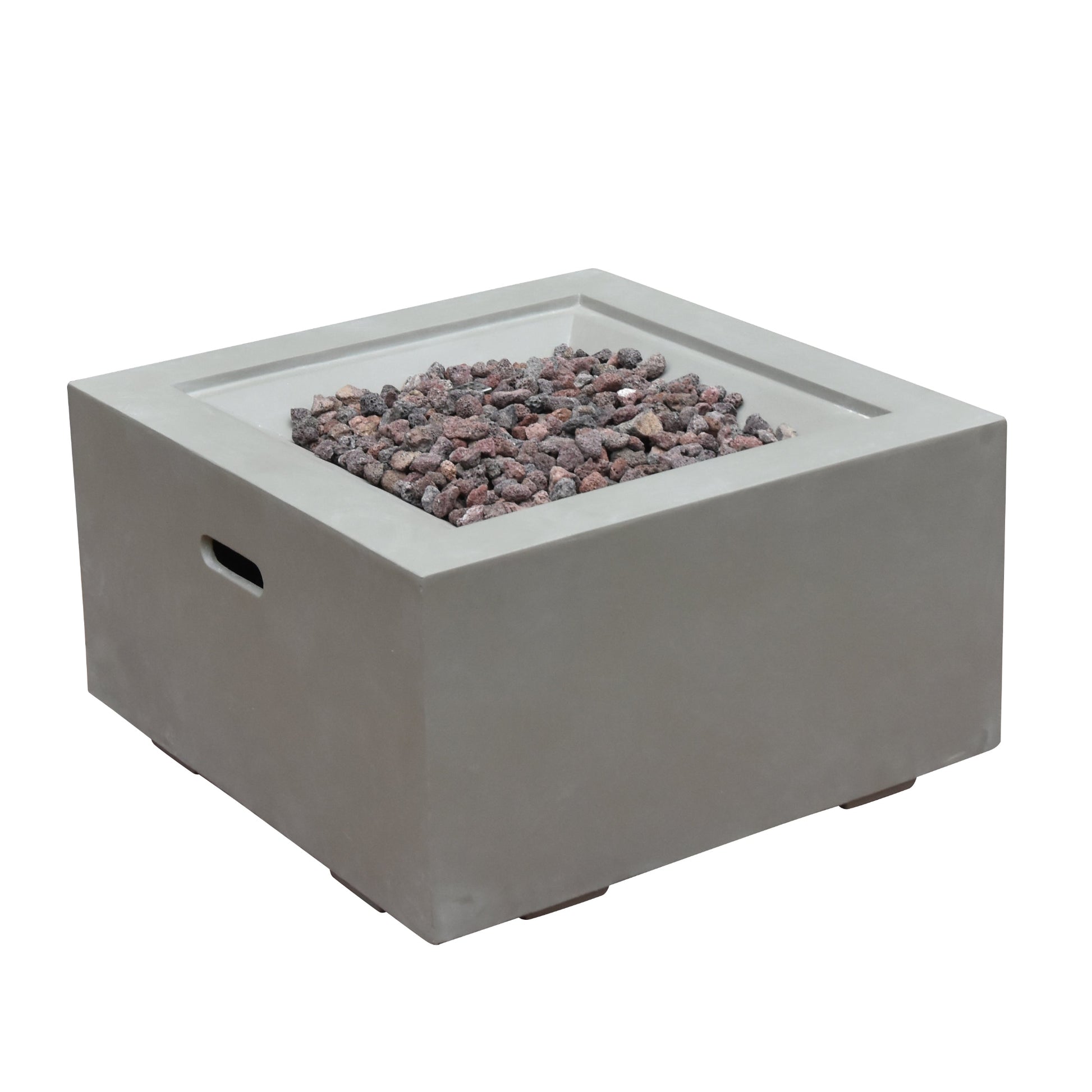 Made from glass-fiber reinforced concrete, the Ridgefield is equipped with a stainless steel burner, push-button spark ignition, and certified safety components. Included lava rock and a PVC cover complete a low-maintenance setup built for consistent outdoor use.