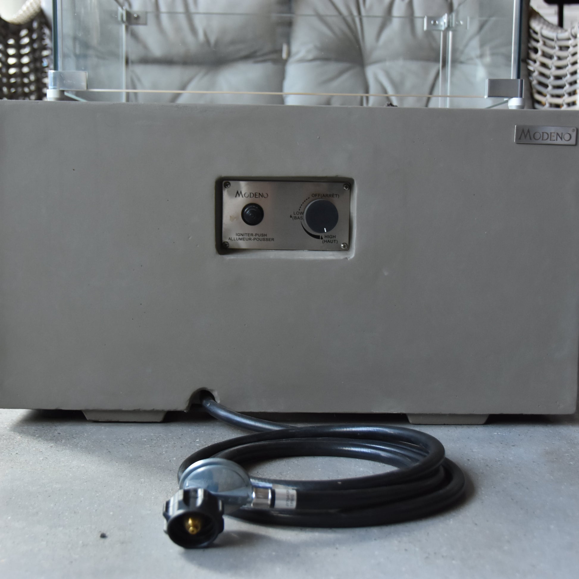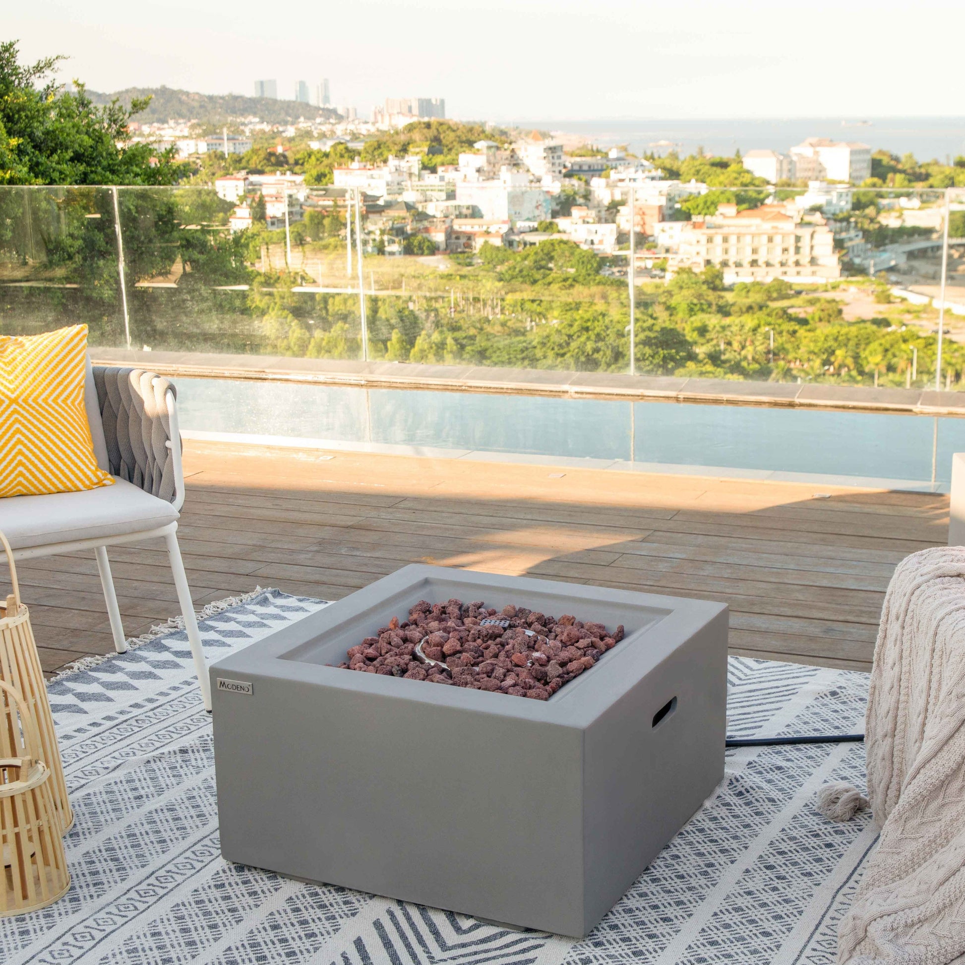 The Modeno Ridgefield Fire Pit Table is a compact fire feature designed to add warmth without dominating the surrounding space. Its clean lines and square burner pan create a modern look that suits both contemporary and transitional outdoor settings.